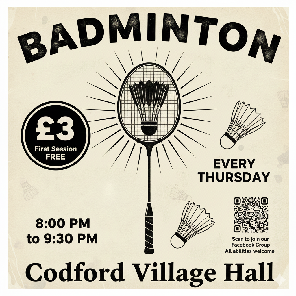 Codford Badminton is a community activity that anyone can turn up and pay to play, there is no membership needed. All abilities are welcome, come and have a go. Rackets are available to borrow.